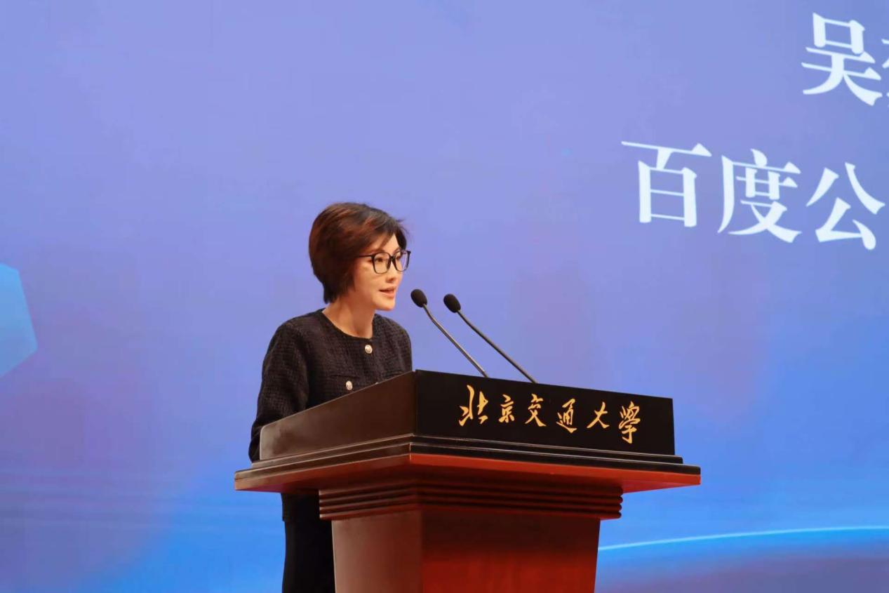 吴梦漪代表百度公司对大会的召开表示祝贺,分享了“萝卜快跑”等人工智能技术应用驱动交通运输领域商业模式创新和生态繁荣的实践。她强调,立法明确无人驾驶法律地位对产业稳定发展至关重要,并呼吁产学研协同为建设交通领域人工智能治理体系贡献力量。